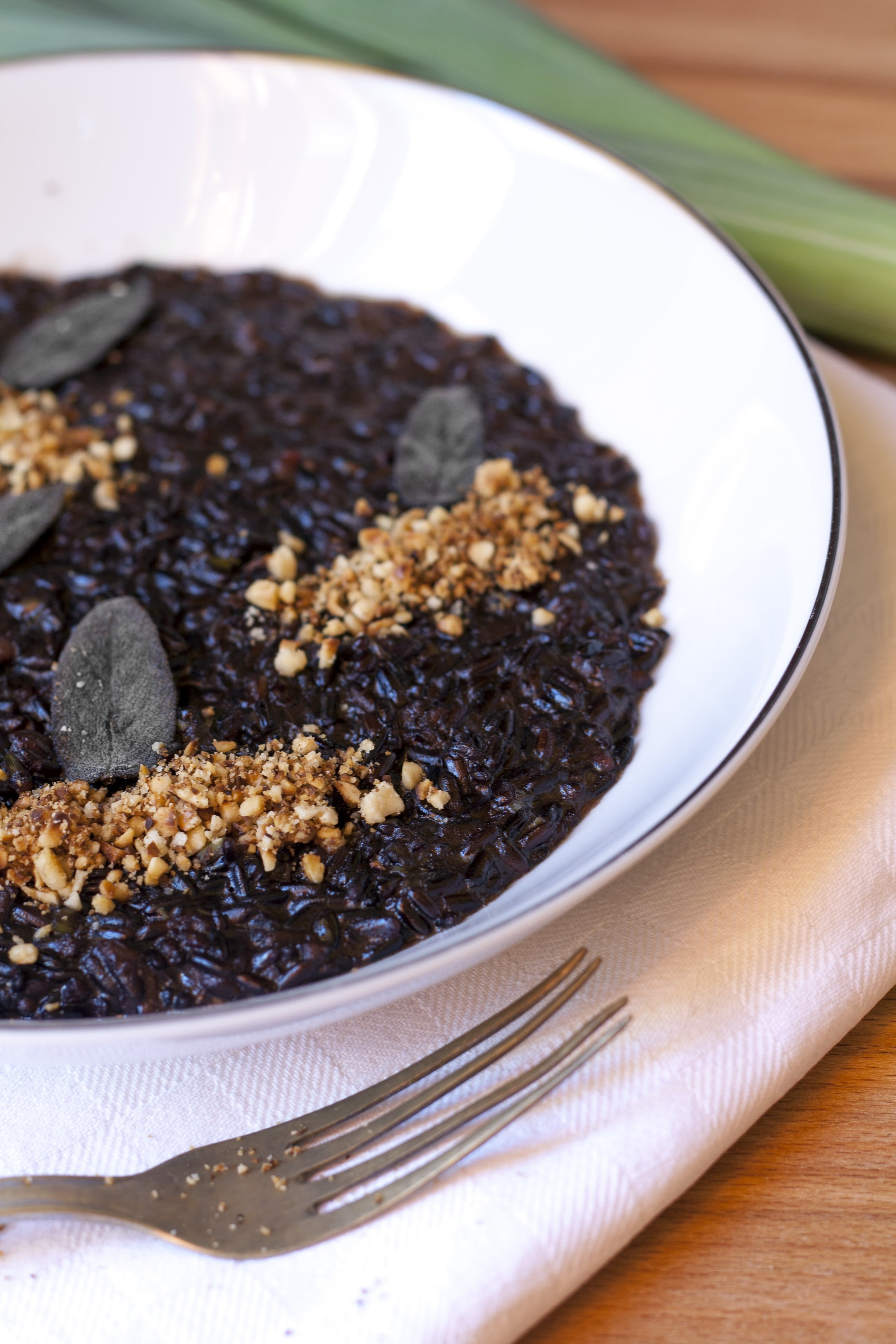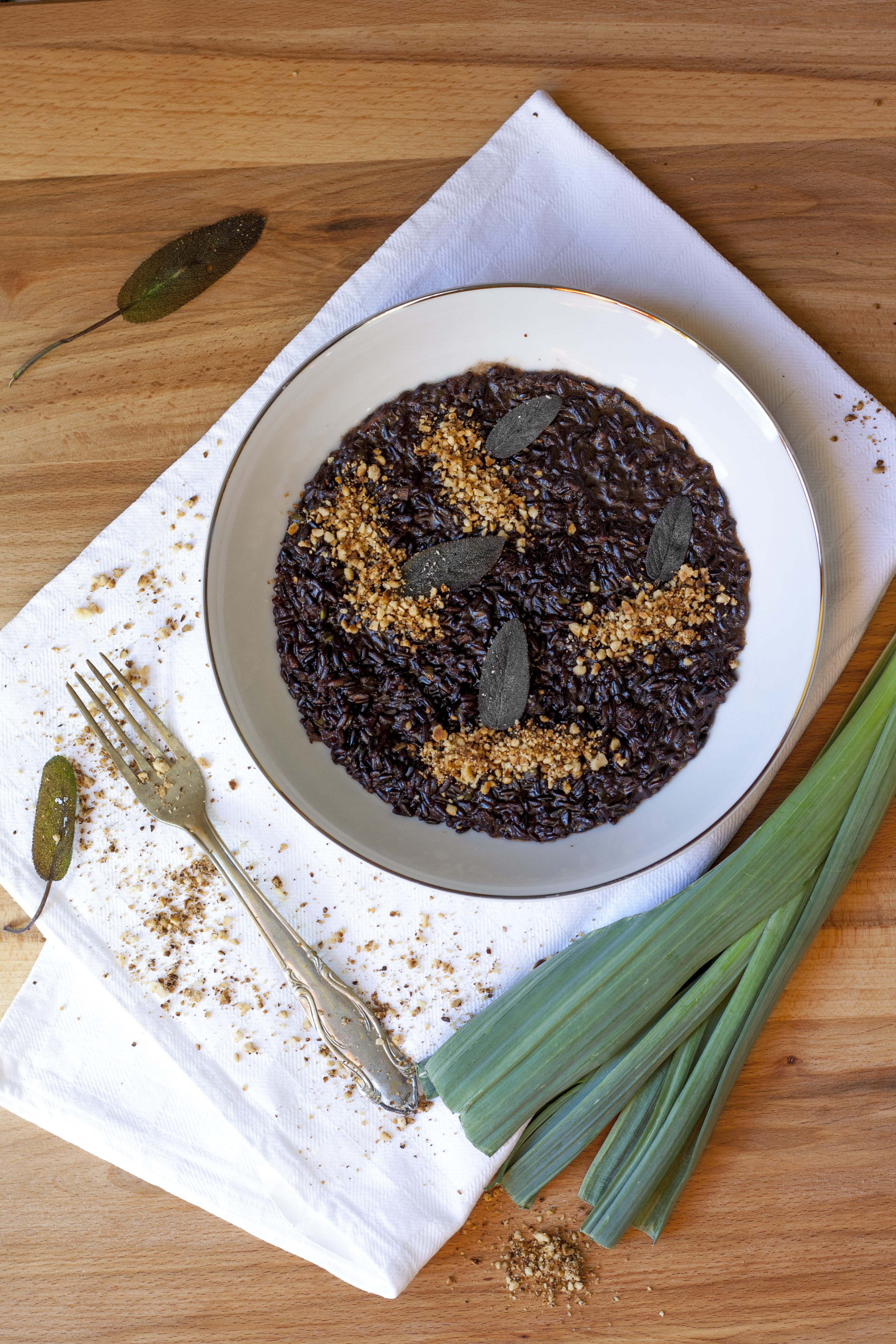 il risotto risulta cremoso e leggermente dolce e croccante (il riso Venere infatti rimane al dente per natura), il porro regala un sapore ancora più dolce, mentre le foglie di salvia e le nocciole equilibrano la dolcezza con i loro sapori decisi e leggermente terracei.